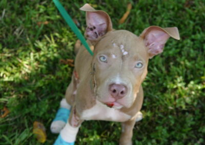 Clover is doing great with medical treatment (bandages, laser therapy, etc). She will have some scarred toes, but uses all 4 feet well. She is progressing through treatment for round worms, vaccines, etc. Once spayed and microchipped, she will be available for adoption.