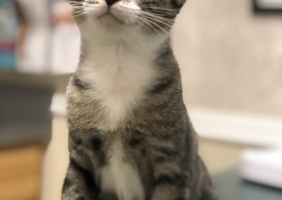 On July 25th at stray kitten was brought to Northwood, found on Chancellorsville Rd and Thomasville Rd. near Chili’s. We guessed his birth date to be about May 22nd. We named him Gibby (the Good Samaritan’s last name was Gibson). He had a large degloved wound (skin pulled away) over his right shoulder/elbow. At first we thought it would require amputation, but it is responding to medical care/bandage changes. Gibby has been neutered, vaccinated and is ready for a home to call his own.