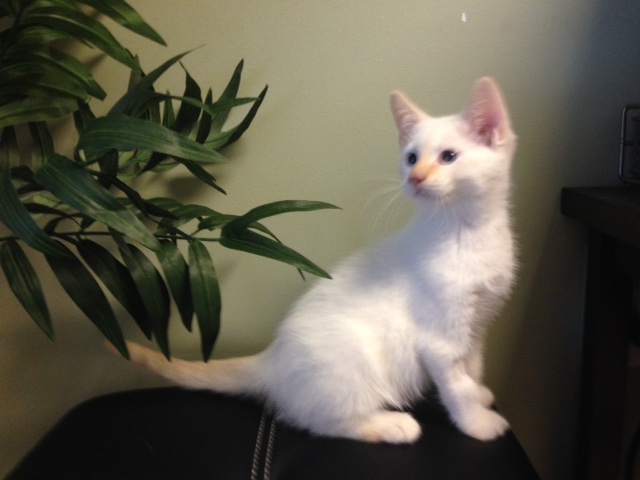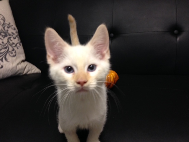 On Oct 2, 2016 a litter of 3 cute white kittens was found on Amelia Circle and W. Tennessee by Mission San Luis. They were only about 6 weeks old. The litter consisted of a 2 white male (with some flame points-Ghost and Goblin) and a male brown tabby (Gremlin). Goblin is a sweet kitten who rarely stops purring. He just wants to be loved! Goblin is healthy, neutered, microchipped, and progressing through his kitten vaccines. Come see him today!