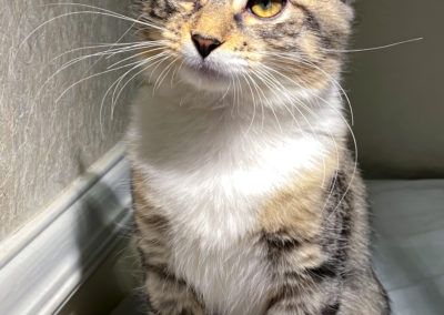 On June 14, 2021 a kitten estimated to be about 7 wks old was brought to Northwood. She was a stray, found on Attapulgus Hwy and 119 SW Rd. in Gadsden Co. She was a DMH brown tabby, DOB 4-18-21. She had a dull mentation and was dehydrated. It was unknown if she had been hit by a car or was ill from malnutrition/dehydration. We named her Lady Violet. She responded well to good nutrition and care. She was treated for ear mites, is FeLV/FIV negative, vaccinated, microchipped and spayed. Lady Violet is ready for her forever home.